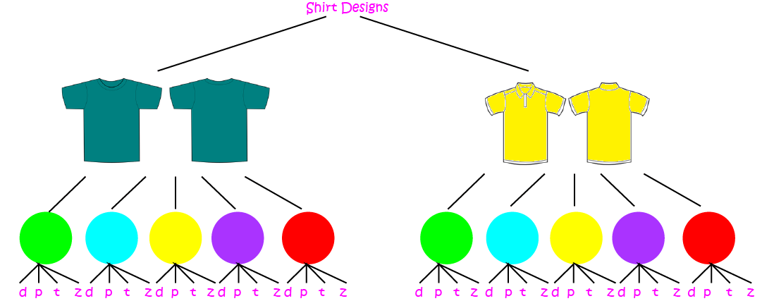 - Use the fundamental counting principle to work out how many different designs for polo shirts there are, and how many different designs for crew-neck t-shirts there are. Then add the two numbers of designs together.
