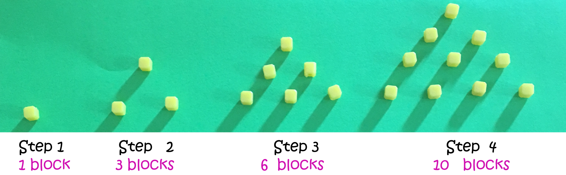 Notice that step 2 is obtained from step one by adding 2 blocks to it, step 3 is obtained from step 2 by adding three blocks to it, and step 4