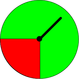 Gus isn't convinced he should paint himself green. He has a niggling feeling that red might be a better colour for him. To keep him happy, Christo designs another spinner that will make it likely that he will choose green, and unlikely (but still possible) that he will choose red. It might look something like the one in the picture. Do you see how most of the spinner is green, but just a small part (in this case \(\dfrac{1}{4}\)) is red? The arrow is much more likely to land on part of the spinner coloured green than it is to land on part coloured red.