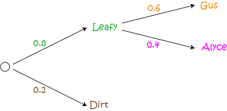 Now, if the leafy track is chosen, Gus has probability 0.6 of winning. So, the probability of Alyce winning on the leafy track is \(1 - 0.6 = 0.4\). Let's fill those probabilities in on the diagram: