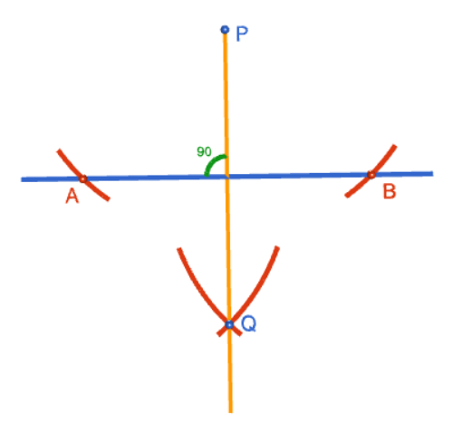 Step 6: Use a straight edge to draw a line from the point \(P\) down to the point \(Q\) where the two arcs cross, as shown in the picture on the left. This will be your perpendicular. The picture on the right shows the finished construction. It doesn't look "perpendicular", but that's just because of the angle of the drawing. You can check the angle with your protractor or a set square. Have fun doing the construction!