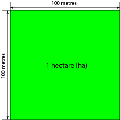 A hectare is a metric unit for area that is used to measure the areas of land and cities. \(1\) hectare (abbreviated as ha) is equal to the area of a square of side length \(100\) metres: