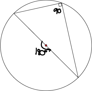 We can see this as a direct consequence of the angle at the centre of the circle theorem (Theorem 1 above). The angle at the centre of the circle in this case is \(180^\circ\) because the angle at the circumference is subtended by a diameter. Therefore, the angle at the circumference is half the central angle, or \(\dfrac{1}{2} (180^\circ) = 90^\circ\).